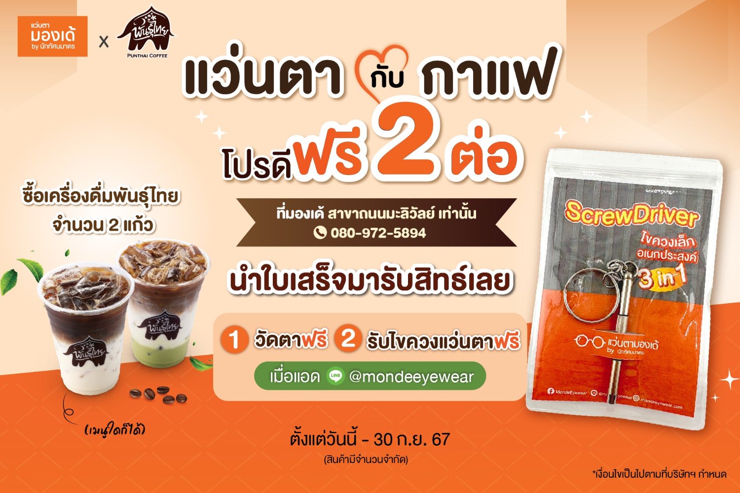 โปรดี ฟรี 2 ต่อ เมื่อซื้อเครื่องดื่มพันธุ์ไทย 2 แก้ว รับสิทธิ์ วัดสายตา และรับไขควงแว่นตา ฟรี!
